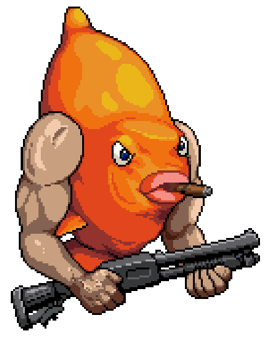 The Fishy is an orange fish with muscled arms. Equipped with a shotgun, Fishy fights underwater enemies in Waves of 10 seconds, which is the duration of their attention span. Fishy also happens to be a fish.